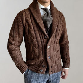 Entdecken Sie die perfekte Mischung aus robustem und elegantem Stil mit diesem außergewöhnlichen Cardigan. Mit einem markanten Zopfmuster-Design und einem einzigartigen Schal-Kragen ist dieses Kleidungsstück aus einem hochwertigen Strick gefertigt, um eine solide Haptik und einen anspruchsvollen Look zu bieten. Seine strapazierfähige und bequeme Konstruktion macht ihn zu einem unverzichtbaren Teil der Garderobe eines jeden Mannes, perfekt, um Ihren lässigen Outfits einen Hauch von klassischem Charme zu verleihen.