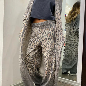 Dieses Set aus langärmeliger Strickjacke mit Leopardenmuster und weiter Hose vereint sexy Minimalismus und zeitlose Eleganz. Es ist bequem, gewagt, feminin, sexy und schick.