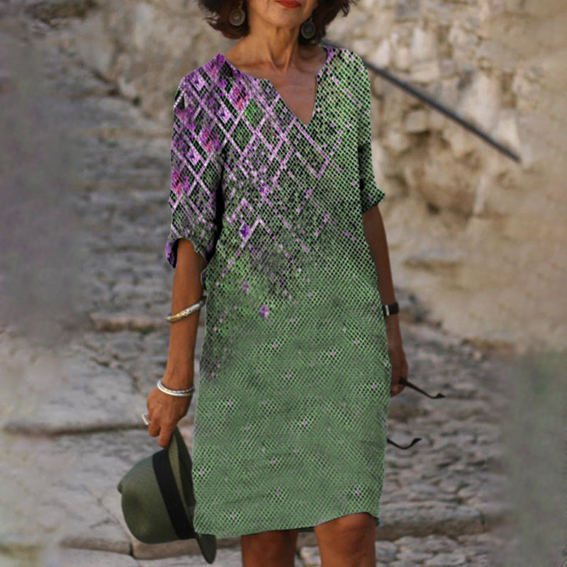 Leichtes, lässiges bedrucktes Kurzkleid mit V-Ausschnitt von Fudus