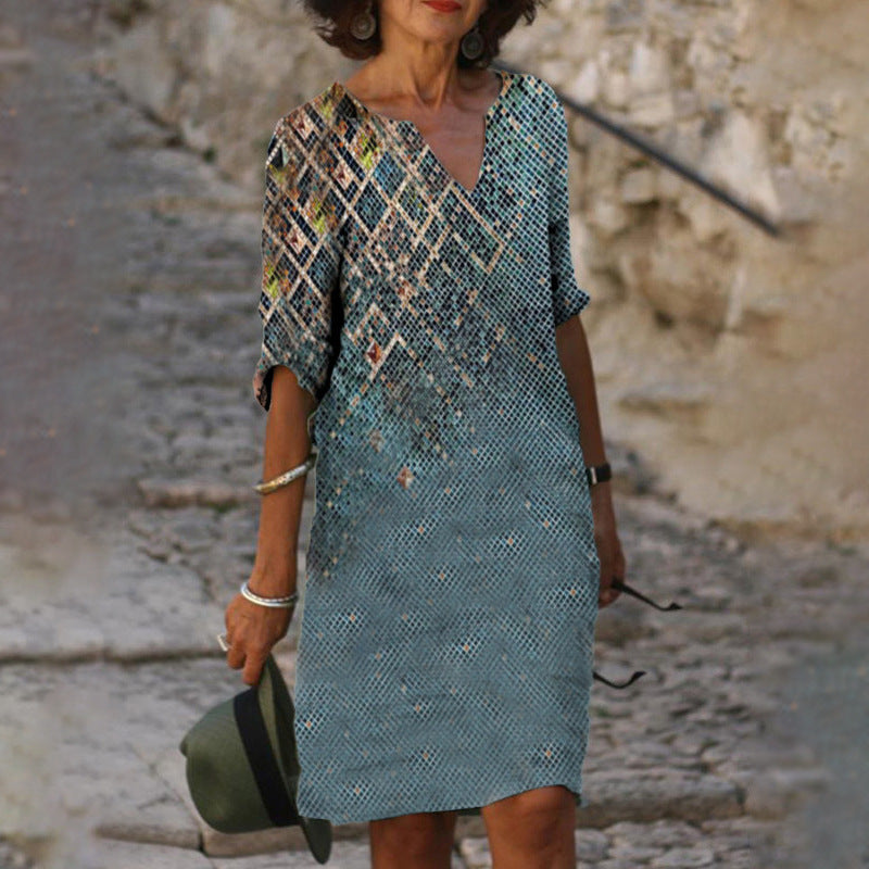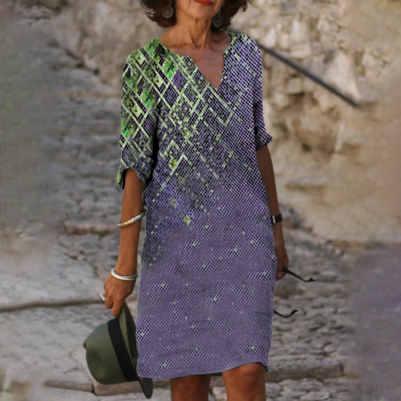 Maxikleid mit V-Ausschnitt und ¾-Ärmeln. Pullover-Stil, bürotauglich und lässig. Bedruckter Stoff.