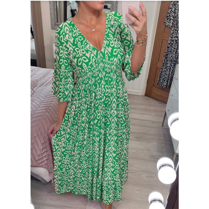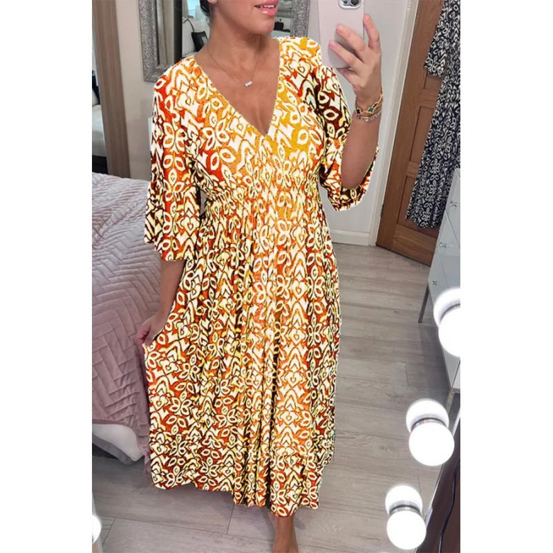 Klassisches Maxikleid im Einteiler-Design mit tiefem V-Ausschnitt. Das Kleid besticht durch ein Blumenmuster, Dreiviertelärmeln und Standardärmeln. Anspruchsvoller Stil, bedruckt.