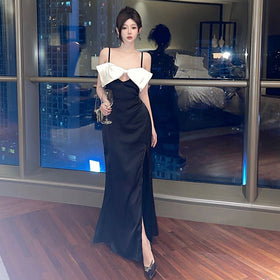 Privater Server Promi Einteiler, langer Rock, Off-Shoulder Ausschnitt, mit Schlitz. Spaghetti-Träger, ärmellos, sexy Stil. Collage/Splicing.