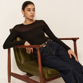 Figurbetontes, langärmeliges Oberteil mit dezentem Mesh-Einsatz oben und Rundhalsausschnitt. Glattes, angenehmes Material mit elastischem Stoff für bequeme Passform.