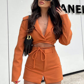 Entdecken Sie dieses zauberhafte Zweiteiler-Set! Der Blazer mit langen Ärmeln, Reverskragen und figurbetonter Passform wird ergänzt durch hochtaillierte, bequem elastische Shorts. Perfekt kombiniert mit Ihren Lieblingsschuhen.