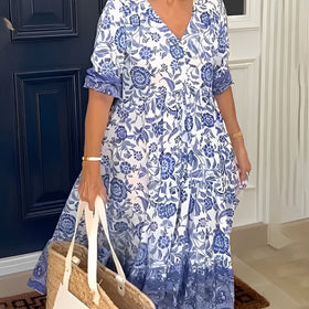 Alinas blaues Sommerkleid ist trendy und luftig, ideal für warme Tage. Das auffällige Muster und der leichte Stoff eignen sich perfekt für entspannte Ausflüge und Sommerfeste. Erhältlich in verschiedenen Größen. Vielseitig kombinierbar für individuelle Looks. Angenehmer Tragekomfort und modernes Design – ein Must-Have für modebewusste Frauen.