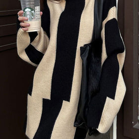 Stilzeits | Einzigartiger Schwarzer Hochgeschlossener Gestreifter Gemütlicher Langer Strickpullover Winter
