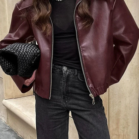 Fügen Sie Ihrem Kleiderschrank ein markantes Element mit einer weinroten Herbstjacke im Lederlook hinzu. Mit ihrem kurzen Schnitt und dem praktischen Reißverschluss ist diese Jacke eine lässige Wahl für kühle Tage.