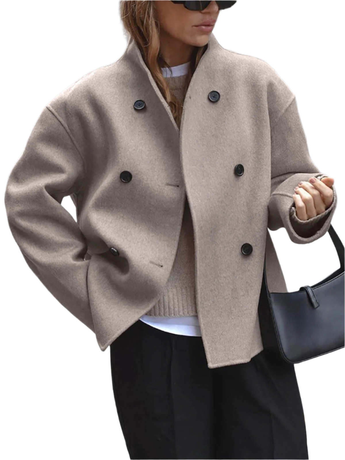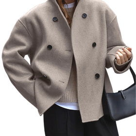 Der Stilzeits Mantel stellt die ideale Verbindung von Stil und Behaglichkeit dar. Entworfen für die moderne Frau, die sowohl Gemütlichkeit als auch Eleganz liebt, bietet dieser Wollmischmantel ein modisches Erscheinungsbild, während der Tragekomfort nicht zu kurz kommt. Die kurze, figurnahe Silhouette und die doppelte Knopfleiste verleihen ihm einen klassischen Flair, der perfekt mit Kleidern und Hosen kombiniert werden kann.