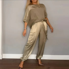 Eleganter und vielseitiger Zweiteiler (Oberteil mit kurzen Ärmeln & Hose) für stilbewusste Frauen. Komfortables Oberteil und schmeichelhafte Hose aus hochwertigen Materialien. Ideal für Büro, Festlichkeiten oder Abendveranstaltungen.