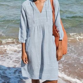 Das Vianne Einfarbige Taschenkleid vereint mühelose Eleganz und Komfort. Dieses knielange Etuikleid aus weicher, atmungsaktiver Baumwollmischung ist vielseitig einsetzbar. Der schmeichelhafte V-Ausschnitt und die 3/4-Ärmel machen es für viele Figurtypen geeignet.