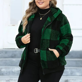 Yunia Fuzzy Plaid Hooded Coat with Pockets